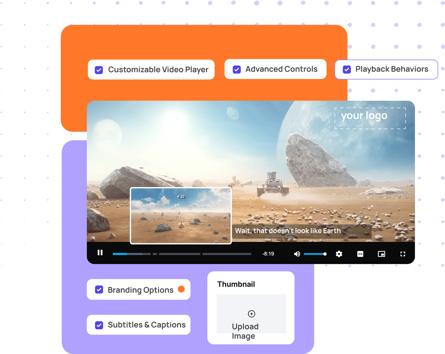 A customizable player with preview thumbnails, speed control, chapters, and adaptive streaming