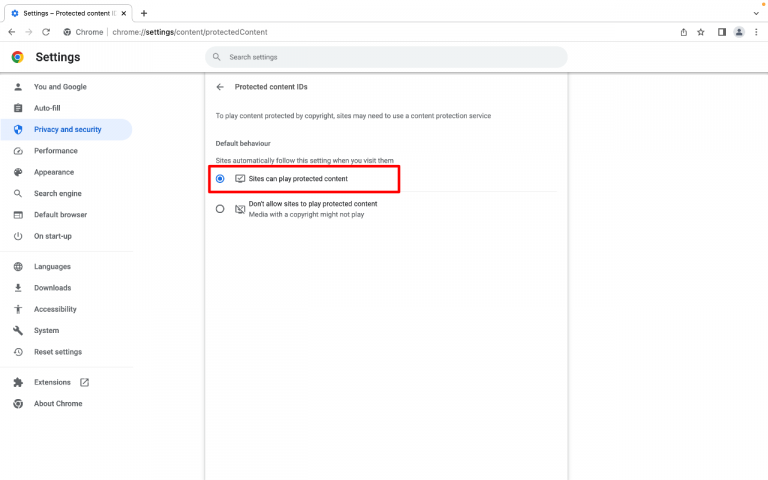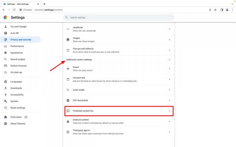 • Click on “Privacy and security” in the left-hand menu and Click on “Site settings.”