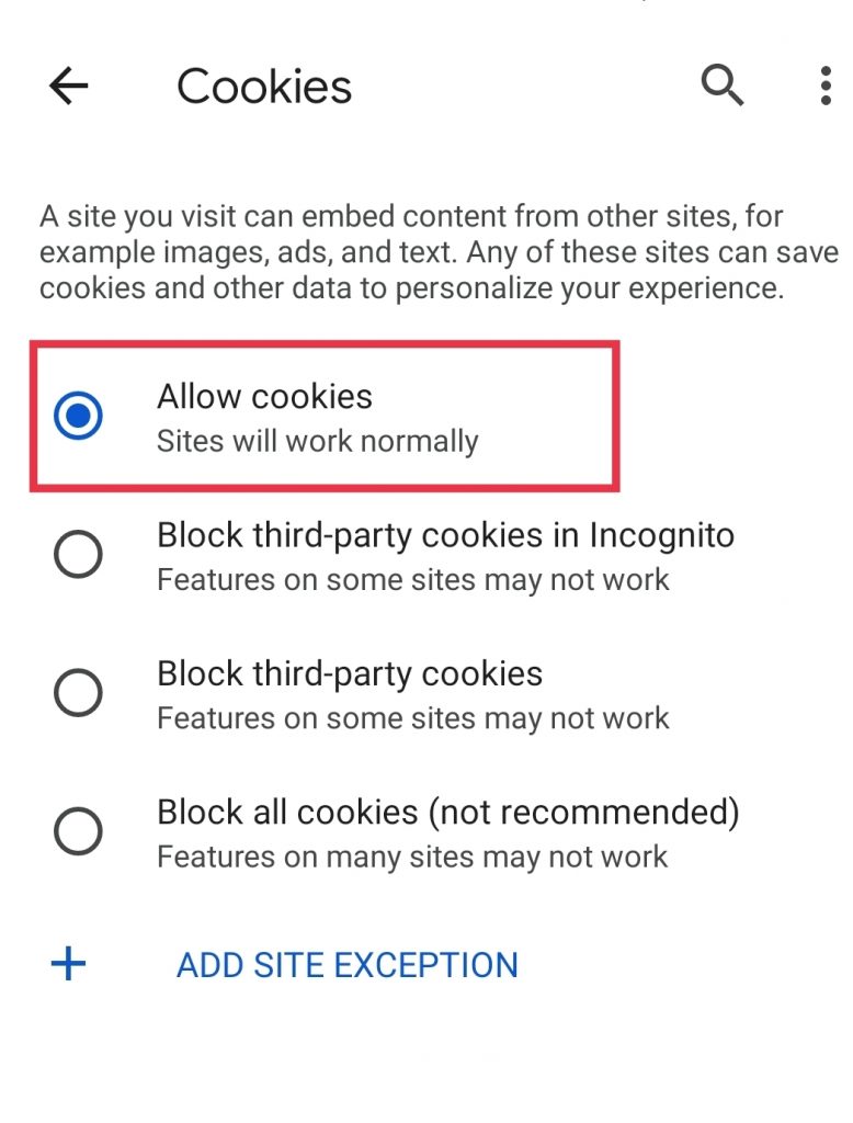 - Finally select “Allow cookies” from the list of options to enable cookies.