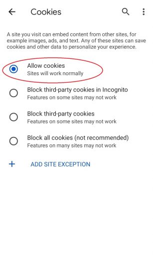 - Select “Allow cookies” from the options to enable cookies.