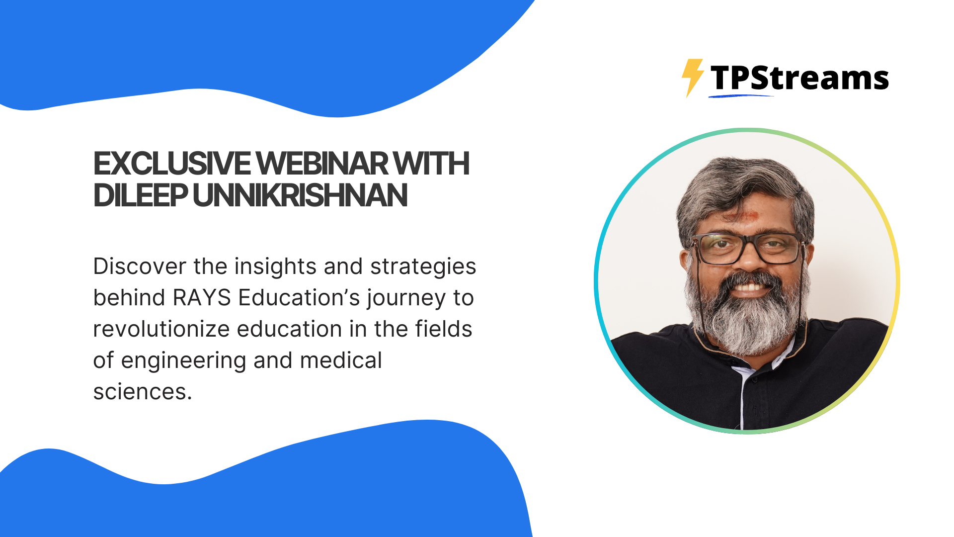 Join the TPStreams Webinar featuring Dileep Unnikrishnan, Co-Founder of RAYS Education, as he shares the inspiring journey of revolutionizing engineering and medical education. Discover key strategies, challenges, and successes in creating a premier educational institution. This is a unique opportunity to gain insights and actionable tips for driving educational excellence and student success!