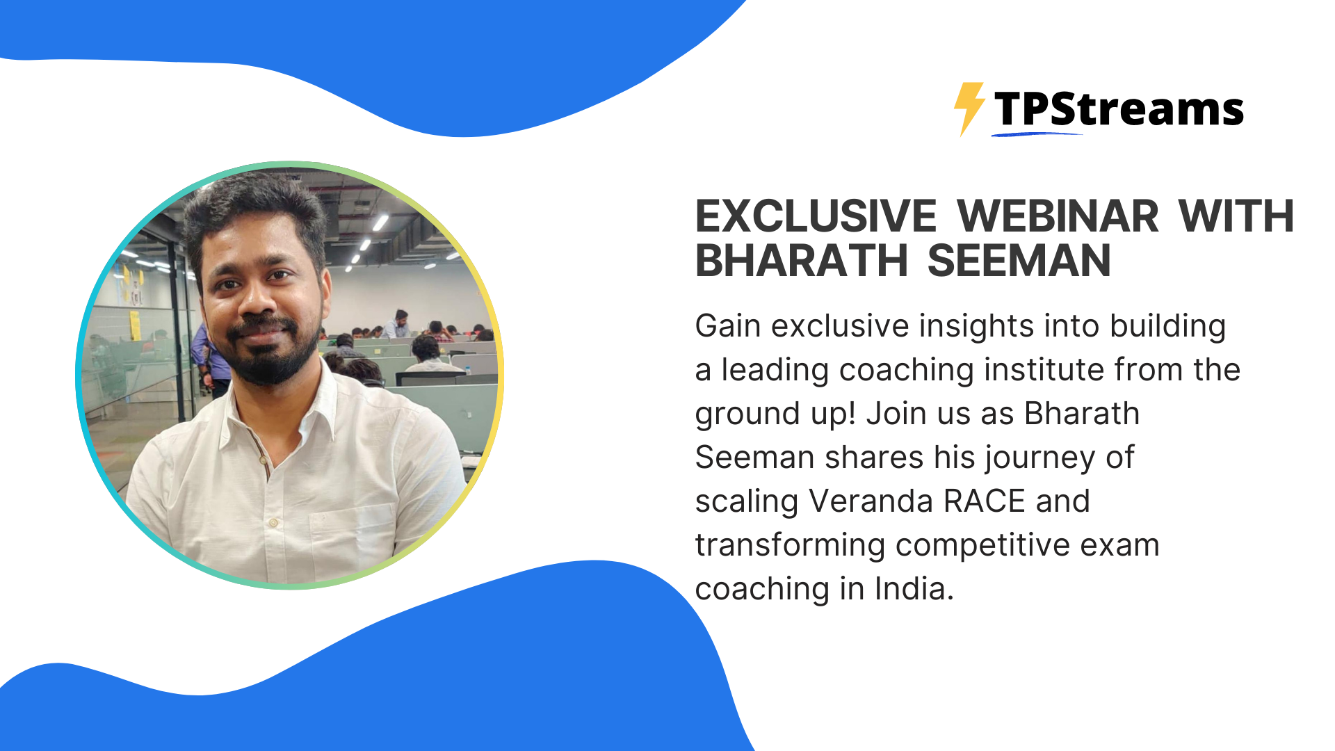 Join us for an exclusive TPStreams webinar podcast featuring Bharath Seeman, the Founder of Veranda Race, as he shares his journey of building one of India’s most renowned coaching institutes for competitive exams. In this session, Bharath will dive deep into how he scaled Veranda Race from scratch, the impact it created for students, and key lessons for aspiring entrepreneurs looking to build successful educational ventures. Don’t miss out on this inspiring conversation!